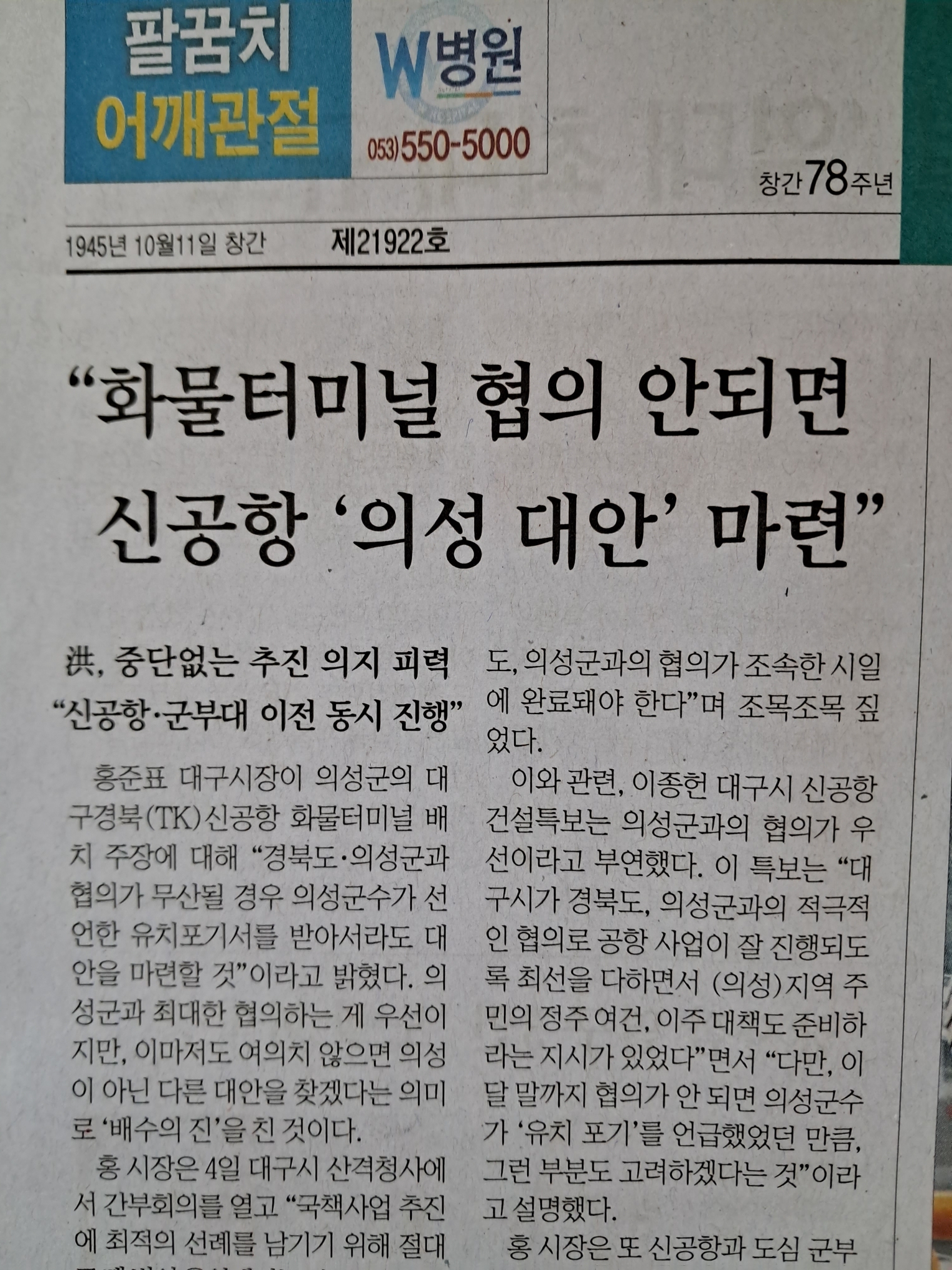 대구경북통합신공항 화물터미널 입지를 둘러싸고 논란이 일고 있는 가운데 홍준표 대구시장이 "대구 군부대 통합이전 사업은 의성군 사례에서 보듯이 대구시가 통제가능한 지역으로 이전을 검
